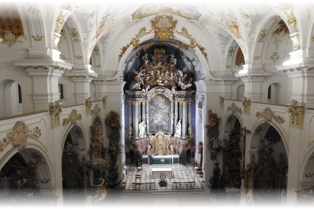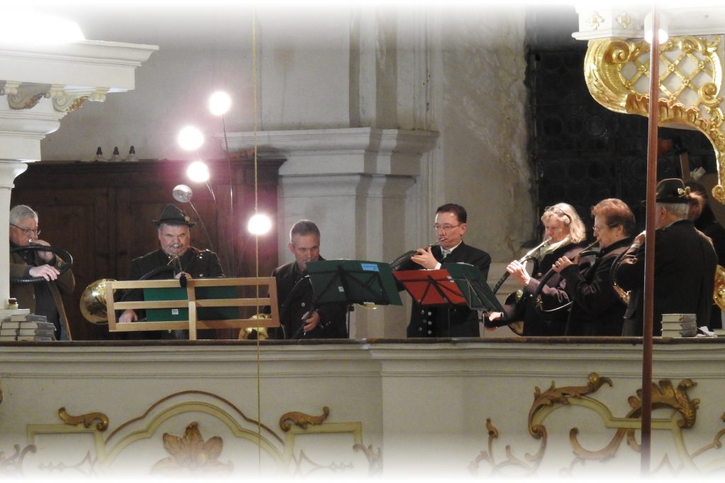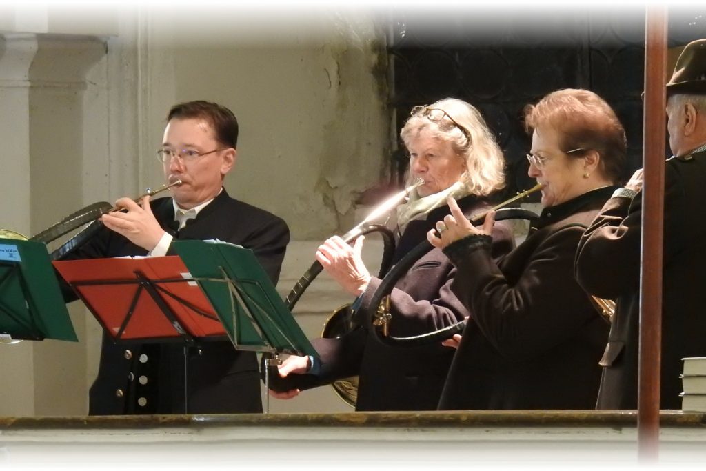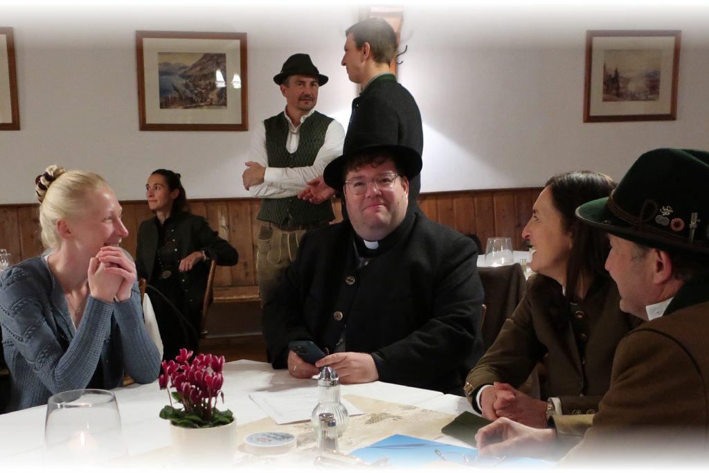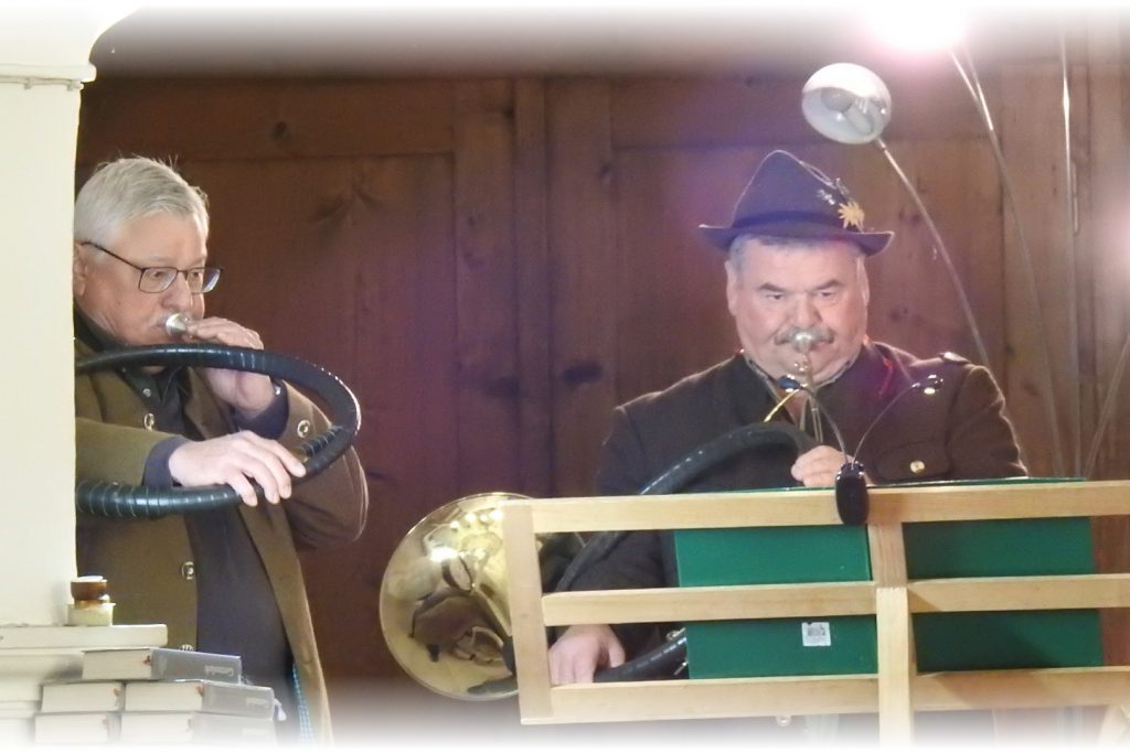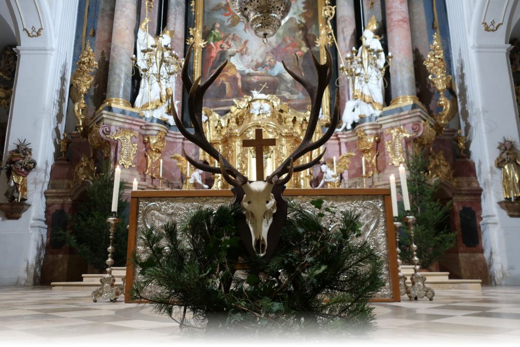 Unter der Leitung von Dekan Neuberger findet die Hubertusmesse, feierlich begleitet von den Wolfratshauser Jagdhornbläsern, deren Hörner die Kirche mit ihrem warmen Klang erfüllen statt.