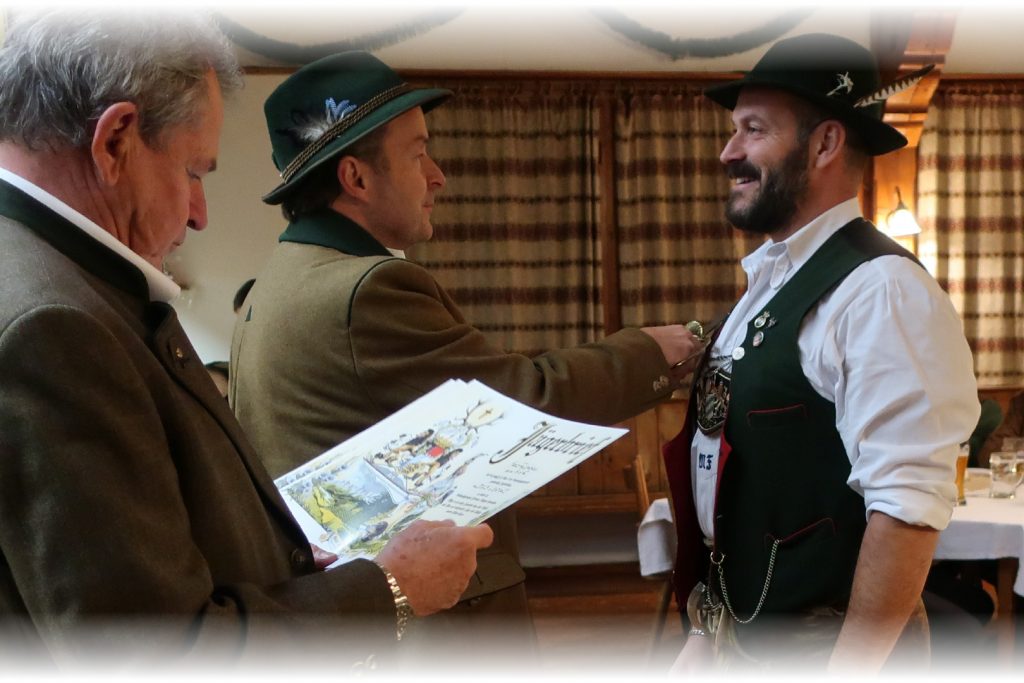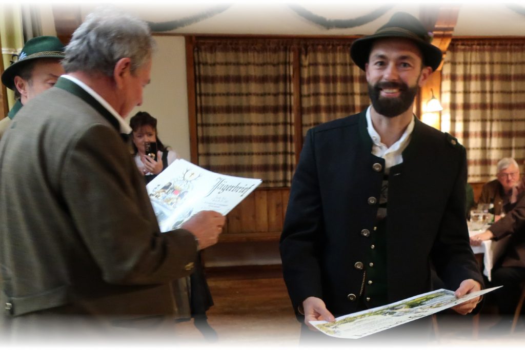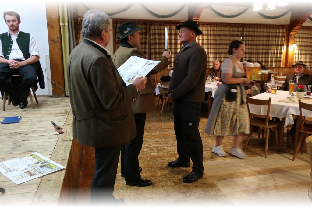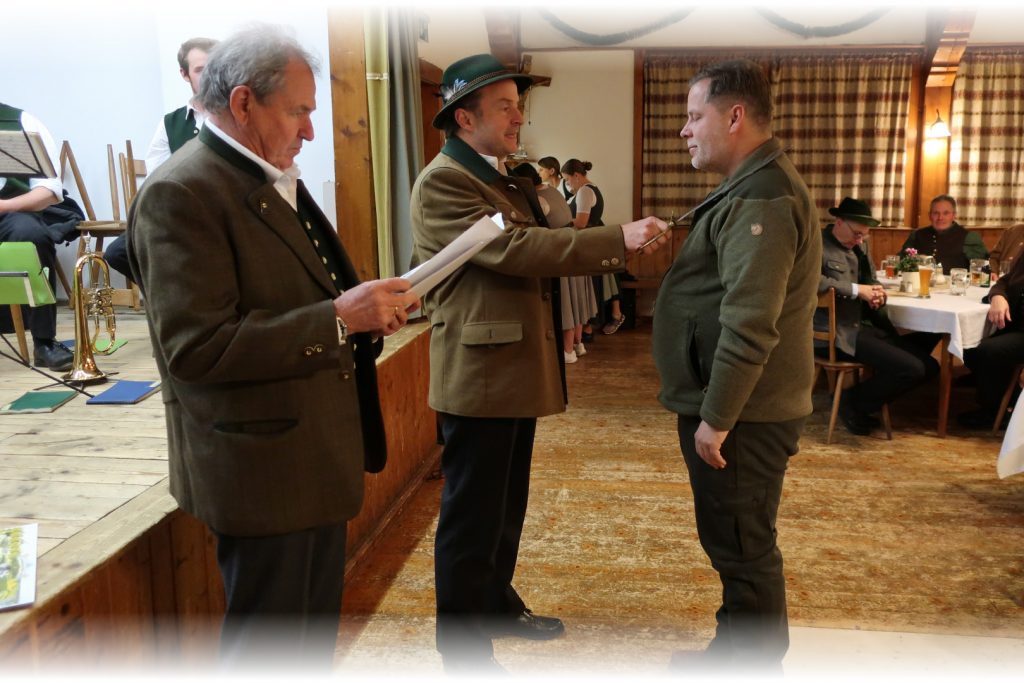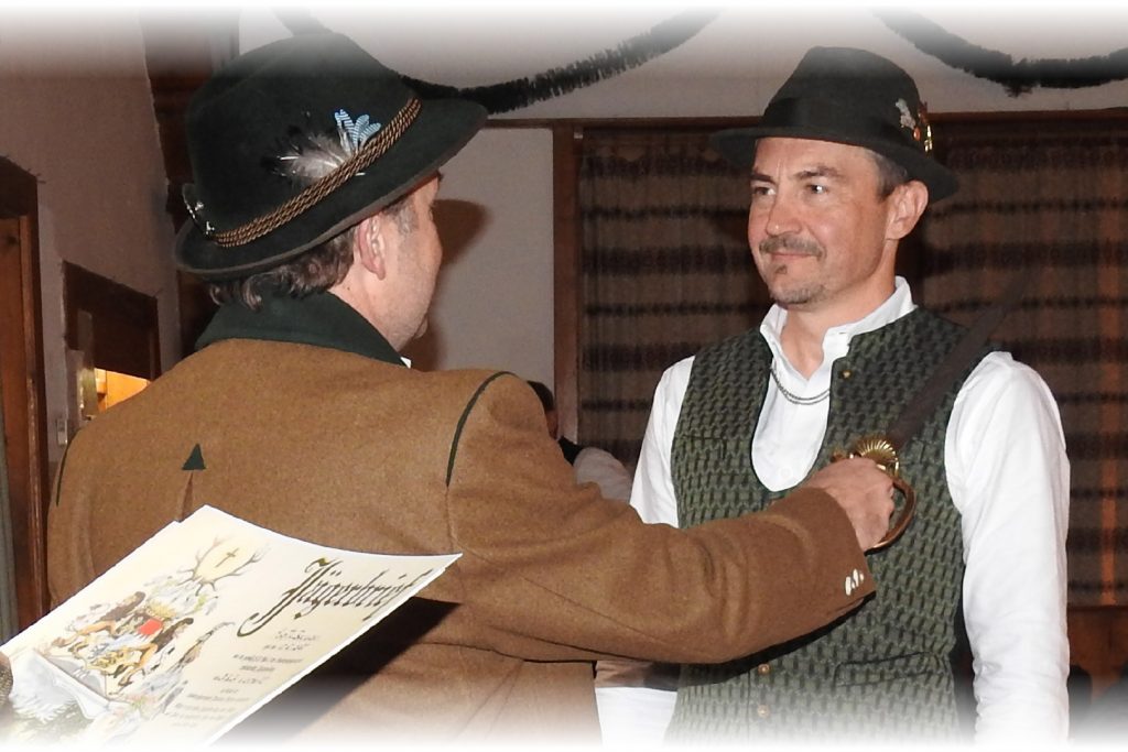 Im Anschluss zieht die Gemeinschaft hinauf zum Gasthof Peiß, wo in Anwesenheit der Geistlichkeit der feierliche Jägerschlag bevorsteht. Dort warten bereits Heinz Repert und Stefan Rührgartner – bewaffnet mit Urkunden, Jagdmesser und einem breiten Lächeln – um den frischgebackenen Jägerinnen und Jägern den Schritt in die Waidgemeinschaft zu besiegeln.