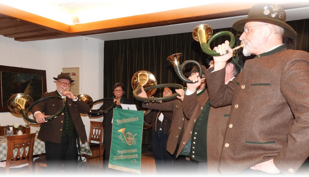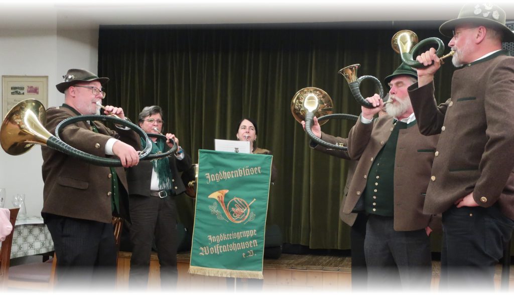 Pünktlich um 19:30 Uhr eröffnete ein feierlicher Auftritt der Jagdhornbläser den Abend und verlieh der Veranstaltung einen würdigen, traditionsbewussten Rahmen.