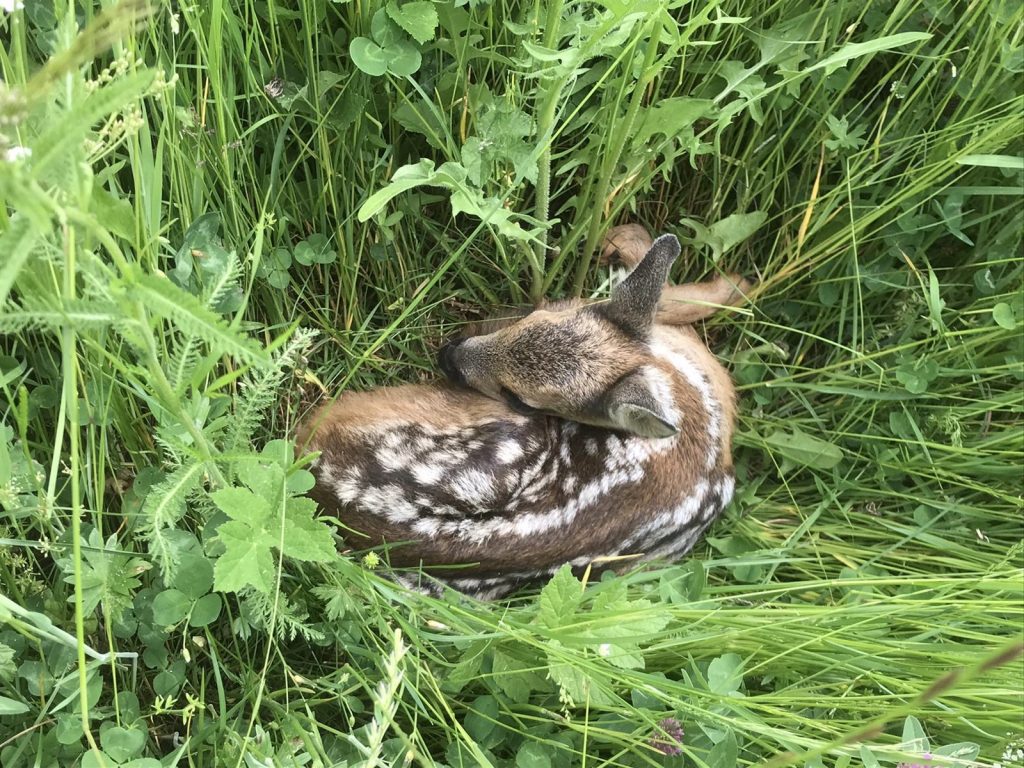 Dort wird das Kitz mit Einweghandschuhen und Grasbüscheln – niemals mit bloßen Händen – vorsichtig aufgenommen, in eine beschriftete Kitz-Kiste gesetzt und abgedeckt am schattigen Feldrand platziert. Nach der Mahd darf das Kitz wieder zurück in die Freiheit.